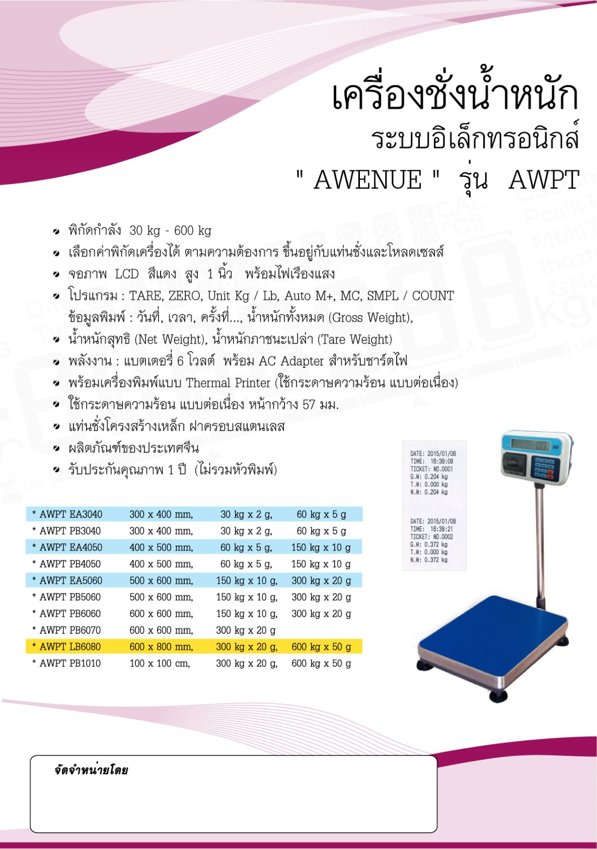 พิกัดน้ำหนัก 60/150 กิโลกรัม ค่าละเอียด 5/10 กรัม