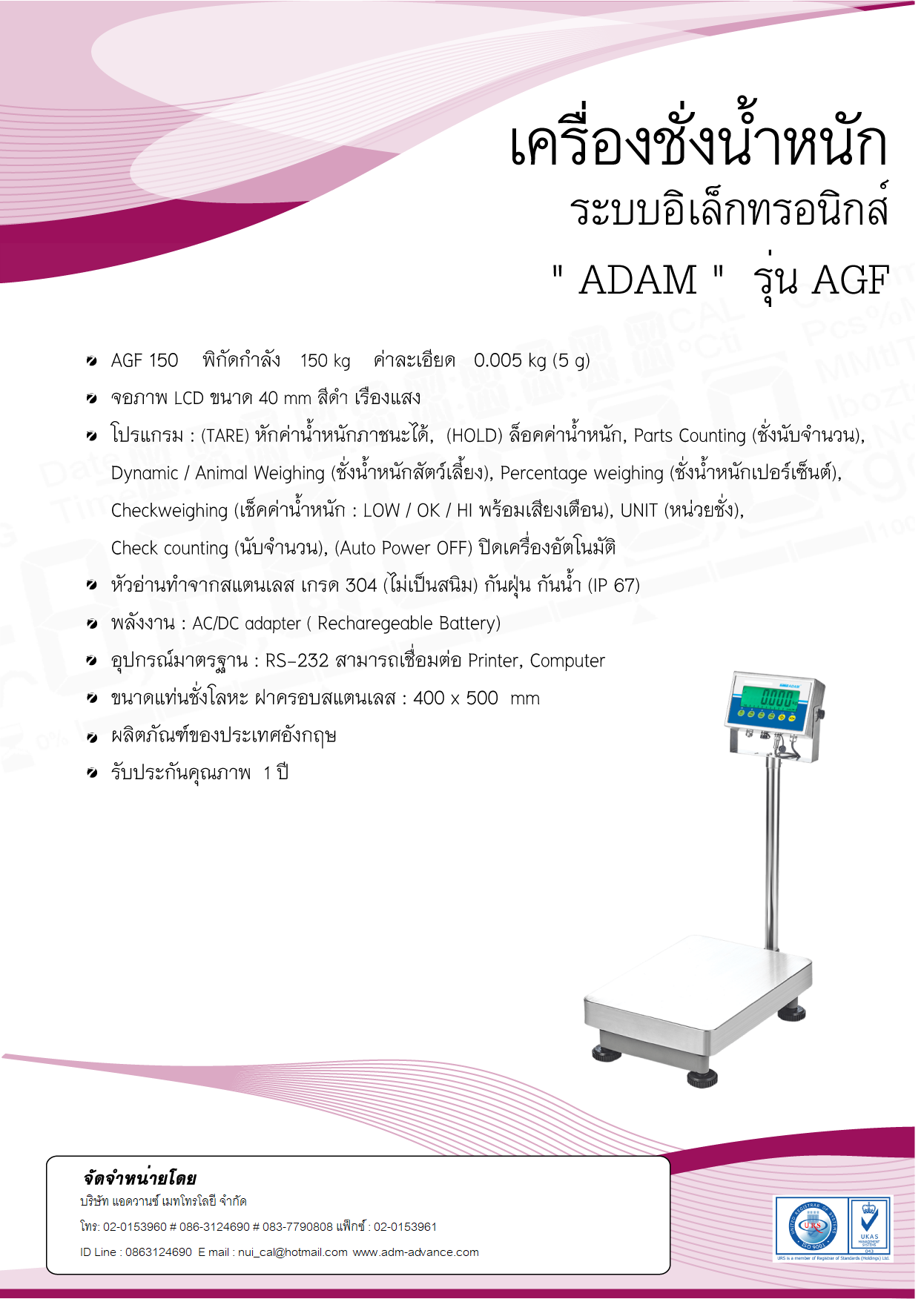 - ชั่งได้สูงสุด 150 กิโลกรัม - ค่าละเอียด 0.005 กิโลกรัม (5 กรัม) - แท่นชั่งเป็นสแตนเลส เกรด 304 (ไม่เป็นสนิม) ขนาด 40 x 50 เซนติเมตร - จอภาพ LCD ขนาด 40 mm สีดำ เรืองเเสง - Backlight สีเขียว - ชั่งได้ หน่วย คือ kg, - หัวอ่านทำจากสแตนเลส เกรด 304 (ไม่เป็นสนิม) - โครงสร้างแท่นชั่งทำจากสแตนเลส เกรด 304 (ไม่เป็นสนิม) - เสาทำจากสแตนเลส เกรด 304 (ไม่เป็นสนิม) - สามารถนับจำนวนชิ้นงานได้ (Counting mode) - สามารถแสดงหน้าจอแสดงผลค่าน้ำหนักค้างไว้ได้ (Hold Function) - ปิดเครื่องอัตโนมัติเมื่อไม่ใช้งาน (Auto Power OFF) - ป้องกันน้ำและฝุ่นมาตรฐาน IP67 - พร้อมช่องต่อสาย RS232C - ใช้แบตเตอรี่แบบชาร์จไฟได้ (Rechargeable Battery) - ใช้หม้อแปลง AC Adapter - ผลิตภัณฑ์ของประเทศอังกฤษ - รับประกันสินค้า 1 ปี สนใจสินค้าและบริการต่าง ๆ กรุณาติดต่อ บริษัท แอดวานซ์ เมทโทรโลยี จำกัด Tel: 089-8233773 # 083-7790808 # 086-3124690 # 02-0153960 Fax : 02-0153961 LINE OA : @adm-adm E mail : a@adm-adm.com E mail : adm@adm-adm.com E mail : admin@adm-adm.com E mail : info@adm-adm.com E mail : md@adm-adm.com E mail : nui_cal@hotmail.com
